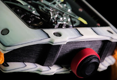 Der Fall besteht aus zwei zusammengesetzten Verbundwerkstoffen und gibt ihm einen gestreiften Blick, der vor kurzem modisch war. TPT Quartz (TPT steht für "Thin Ply Technology") ist ein von North Thin Ply Technology (NTPT) entwickeltes Material, ein Schweizer Komposit-Spezialist, der Komponenten für Rennwagen und Flugzeuge herstellt. Im wesentlichen Stränge von Quarzfasern, die mit Siliciumdioxidfäden in einem weißen Harz vermengt sind , wird der weiße TPT-Quarz wiederholt in 45-Grad-Winkeln mit NTPT-Kohlenstoff (die die grauen Streifen im Fall bilden), eine Form von Kohlenstoff-Komposit mit einem unverwechselbaren Woodgrain-Aussehen geschichtet .